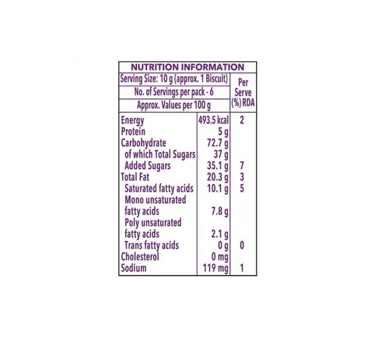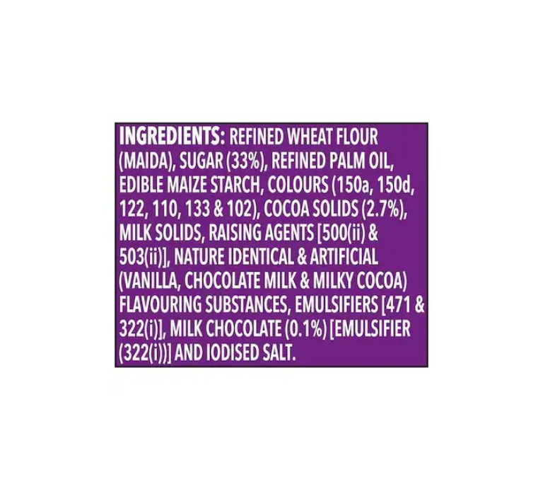 Refined Wheat Flour (Maida), Sugar (33%), Refined Palm Oil, Edible Maize Starch, Colours (150a, 150d, 122, 110,133 & 102), Cocoa Solids (2.7%), Milk Solids, Raising Agents [500(i) & 503(i)], Nature Identical & Artificial (Vanilla, Chocolate Milk & Milky Cocoa)
